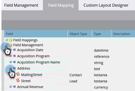 Zoek het veld dat u wilt zien en klik op de knop + om de toewijzing uit te breiden.