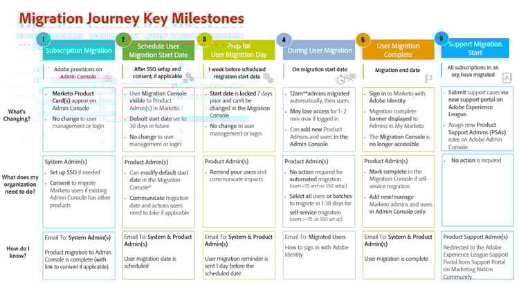 Adobe migreert eerst uw Marketo Engage-abonnement(en) naar de Adobe Admin Console en migreert vervolgens alle bestaande gebruikers met geverifieerde e-mailadressen. Als u een Systeembeheerder of Marketo-productbeheerder bent, ontvangt u e-mails met instructies voor de migratie. Hier volgt een tijdlijn van wat u kunt verwachten: