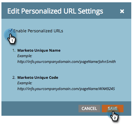 Controleer het vak Enable Personalized URLs en klik op Save .