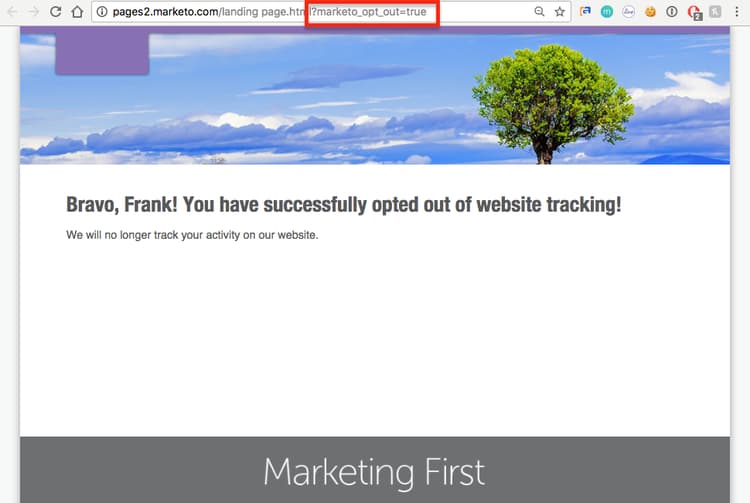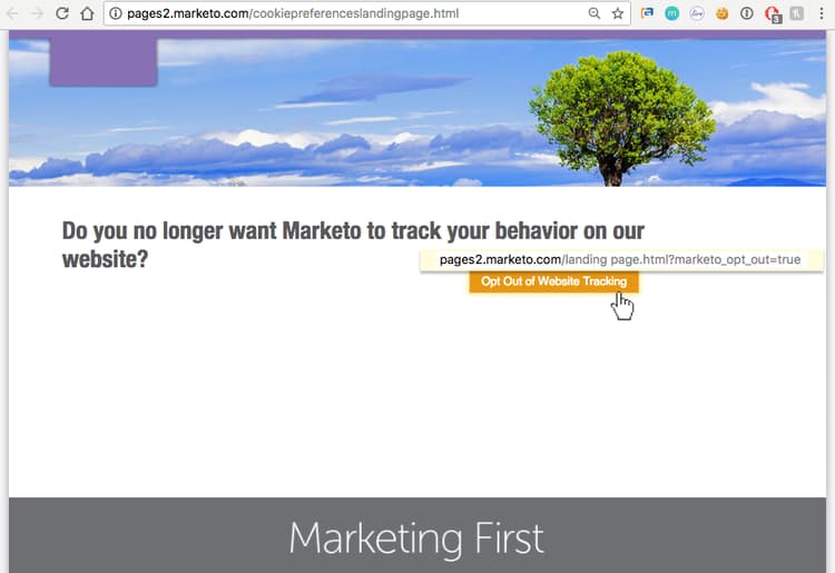 Hier is een webpagina met een knop met de parameter "?marketo_opt_out=true" in de opt-out-koppeling.