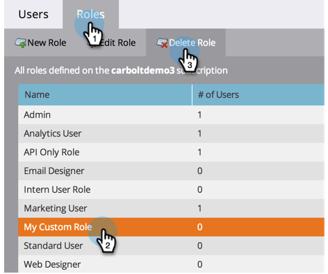 Selecteer een rol onder het tabblad Roles en klik op Delete Role .
