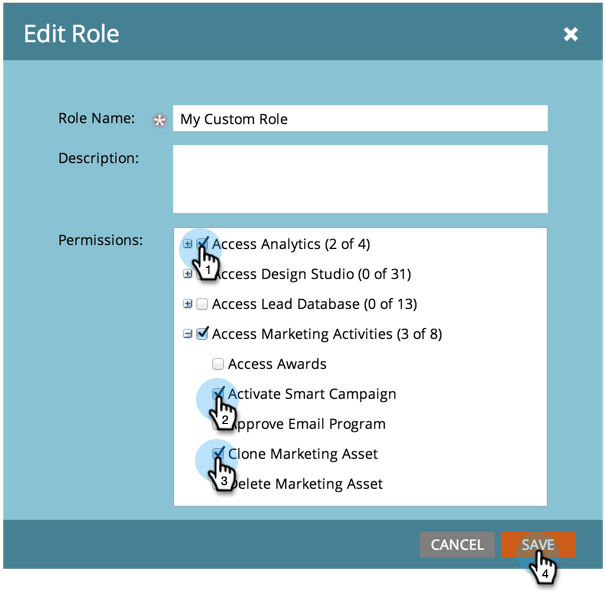 Rollen groeperen samen een groep toestemmingen. Toestemmingen staan u toe om dingen in Marketo te doen. U wijst a rol aan een gebruiker toe. Eenvoudig als taart.