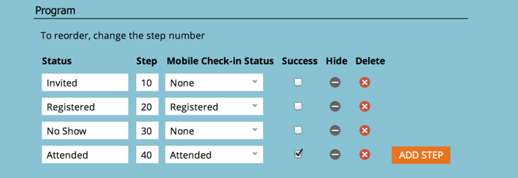 Programmastatus zijn de stappen die mensen doorlopen in een programma (bijv. Uitgenodigd, RSVP'd, Bijgewoond, Geen show). Deze stappen worden bepaald door het kanaal .