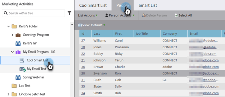 Selecteer een lijst of slimme lijst met personen in de lijst en ga vervolgens naar het tabblad People .
