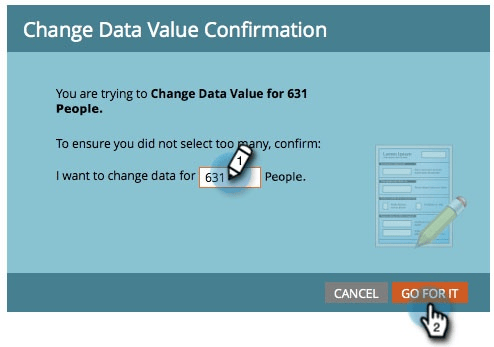 Als u gegevenswaarden voor een groot aantal mensen verandert, kunt u de verandering moeten bevestigen door het aantal te typen. Klik op Go For It.