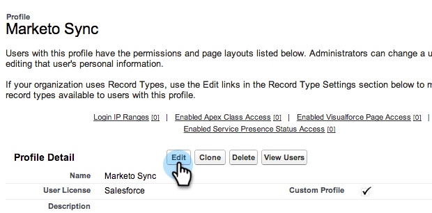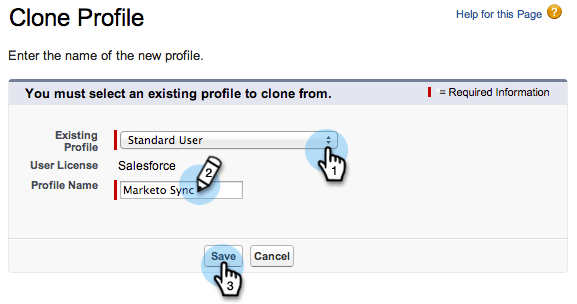 Selecteer Standard User , geef het profiel de naam "Marketo-Salesforce Sync" en klik op Save .
