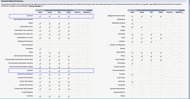 Controleer onder de sectie Standard Object Permissions of de machtigingen Read , Create , Edit en Delete zijn ingeschakeld voor Accounts en Contacts .