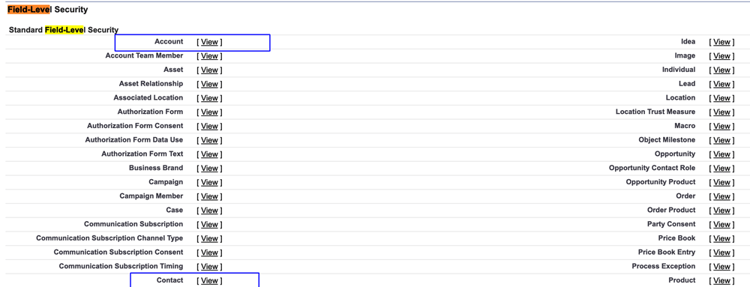 Ga in de pagina profile detail naar de sectie Field-Level Security . Klik op View om de toegankelijkheid voor de objecten Contact en Account te bewerken.