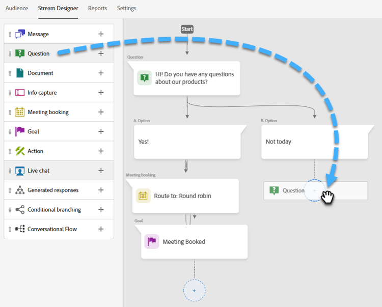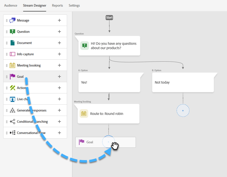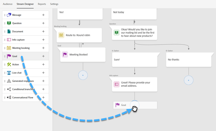 Er zijn vele mogelijke stroomcombinaties. Dit artikel bevat een voorbeeld waarin de marketeter de sitebezoeker vraagt of hij productvragen heeft. Zo ja, dan kan de bezoeker een afspraak plannen. Zo neen, dan kan de bezoeker zich bij een mailinglijst aansluiten voor toekomstige correspondentie. Ze krijgen ook een gratis PDF aangeboden. Het uiteindelijke doel is of een afspraak te plannen of de e-mail van de bezoeker te verzamelen.
