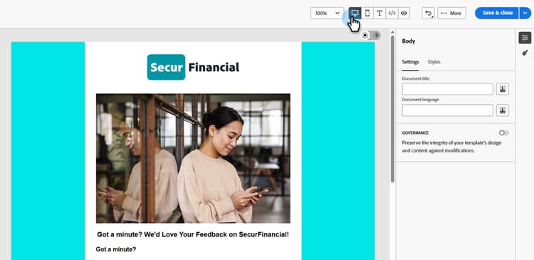 Met de geavanceerde HTML-modus kunt u de onbewerkte broncode van e-mailsjablonen rechtstreeks vanuit de Marketo Engage E-mailinterface van Designer weergeven en bewerken.