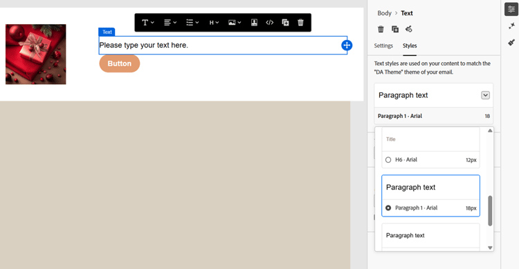 note note NOTE Het tabblad Stijl ziet er anders uit dan een traditionele e-mail met handmatige opmaak, waarin u meer creatieve vrijheid hebt om een component op te maken.