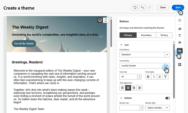 Met merkthema's kunt u eenvoudig herbruikbare inhoud maken die past bij een bepaald merk en een bepaalde ontwerptaal door aangepaste opmaak toe te voegen aan uw e-mailsjablonen.