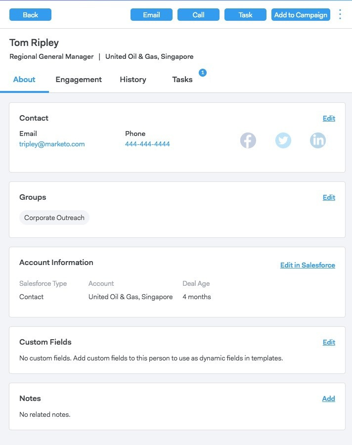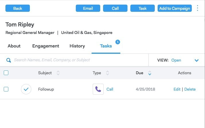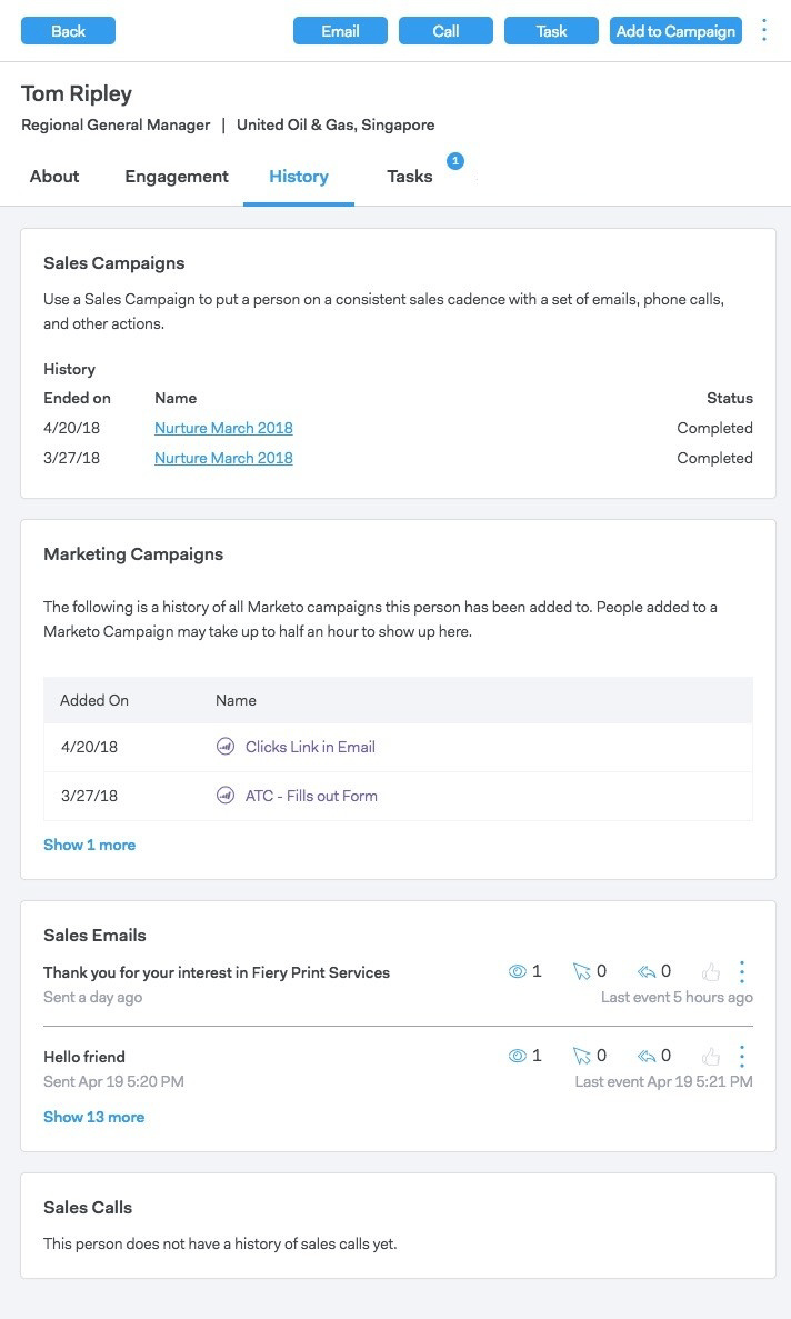 - Bekijk alle e-mails die u deze persoon hebt verzonden en de gegevens over de betrokkenheid