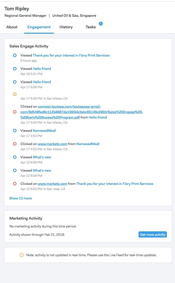 - Bekijk de betrokkenheidsactiviteiten van uw e-mails en campagnes voor verkoop