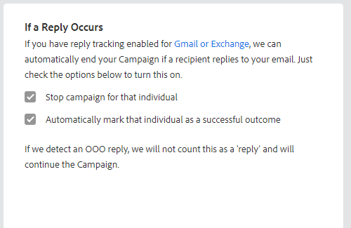 Als voor Gmail of Exchange de functie voor het bijhouden van antwoorden is ingeschakeld, kunnen we uw verkoopcampagne automatisch beëindigen als een ontvanger op uw e-mail reageert.