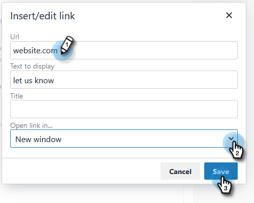 Voer een URL in, bepaal of u de koppeling in het huidige of een nieuw venster wilt openen en klik op Save .