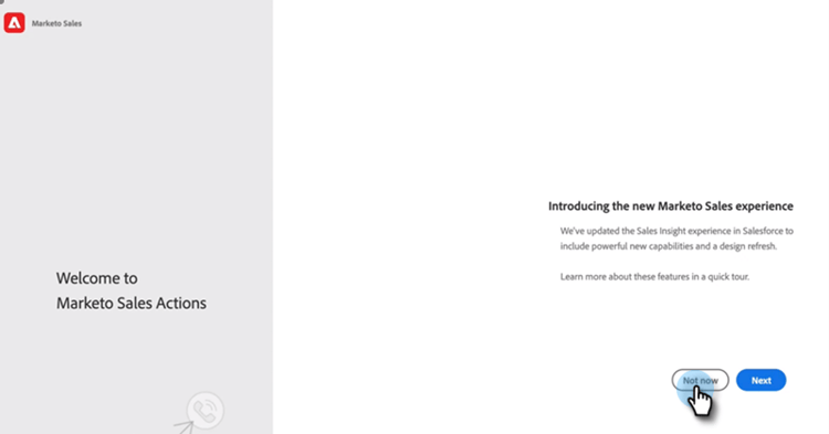 Je ziet de optie om een korte inleiding op Marketo-verkoopacties te bekijken. Klik op Next om weer te geven of op Not Now om voor later op te slaan.