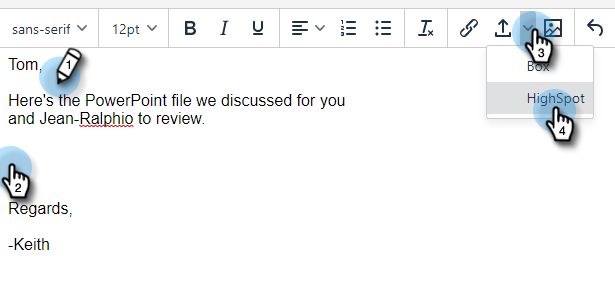 Schrijf je bericht. Klik op de plaats in de e-mail waar u de inhoud voor hooglichten wilt invoegen. Klik de pijldrop-down (naast het beeldpictogram) en selecteer Hoogtepunt.