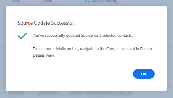 Nadat u het juiste Source-type voor de geselecteerde contactpersonen hebt geselecteerd, wordt een bevestigingsvenster weergegeven ter bevestiging van de geslaagde update.