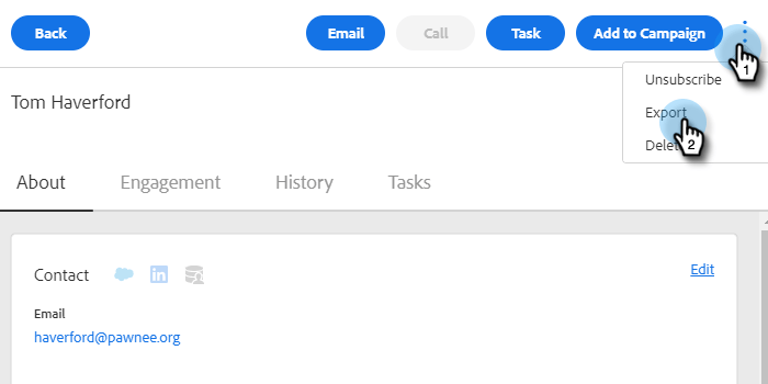 Als u contactgegevens wilt exporteren, klikt u op de drie verticale punten in de koptekst van de Gedetailleerde weergave voor personen en selecteert u Export . Het .CSV-bestand wordt automatisch gedownload.