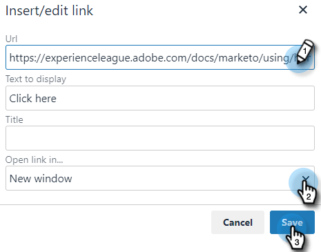 https://experienceleague.adobe.com/docs/marketo/using/home.html?lang=nl-NL). Kies of u de URL in hetzelfde of in een nieuw venster wilt openen en klik op Save .