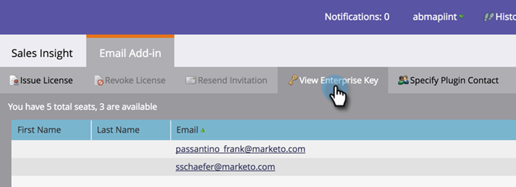 Vaak hebben verkopers geen beheerrechten op hun laptops en zijn hun IT-teams verantwoordelijk voor de installatie van alle software op afstand. De Marketo Add-in voor Outlook kan op deze manier worden geïnstalleerd met behulp van uw Enterprise Key, die u vindt in de sectie Sales Insight van Admin. Als u niet de Belangrijkste knoop van de Onderneming van de Mening ziet, contacteer Steun van Marketo om het toe te laten.