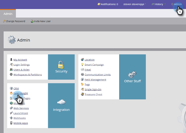 - Klik in Mijn Marketo op Admin en vervolgens op Sales Insight .