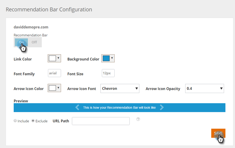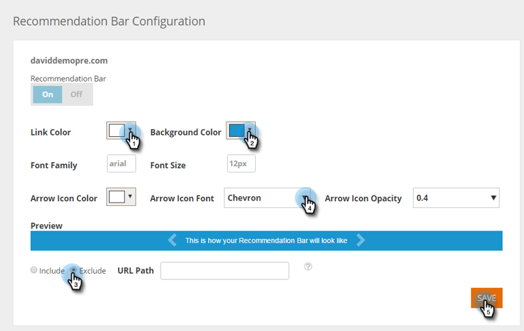 Als u een URL wilt aanpassen, selecteert u kleuren, stijlen, opmaak, pijlen voor de aanbevolen balk en pagina's die u wilt opnemen in of uitsluiten van de balk. Aanpassen aan de branding van uw website. Klik op Save.