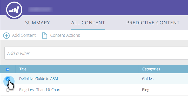 Schakel op de pagina All Content het vakje naast het stuk inhoud in om het te selecteren.