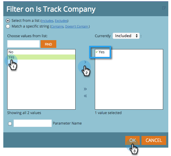 Selecteer Yes in het dialoogvenster dat wordt weergegeven en klik op de pijl naar rechts in het midden. Hiermee filtert u alleen de fasen met "Bijhouden op account" ingeschakeld. Klik op OK wanneer u klaar bent.