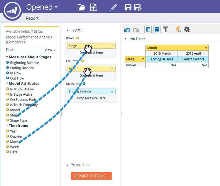 U wordt aangeraden om in de velden Stage , Month en Ending Balance te slepen om de voortgang van bedrijven in uw model met de maand weer te geven. Gebruik filters om de gewenste maanden te selecteren.