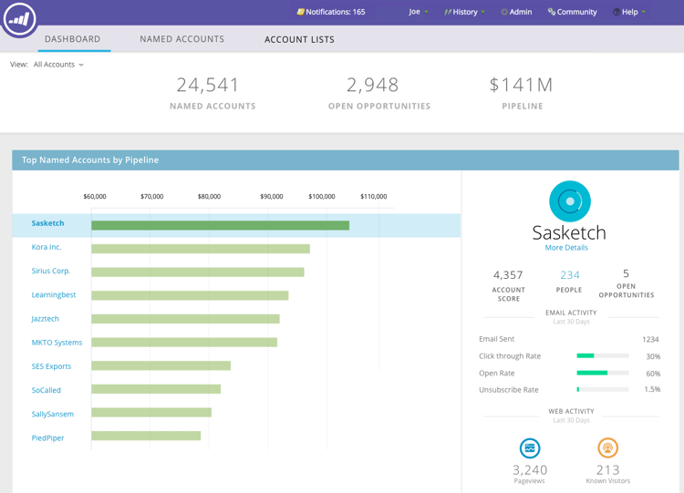 Het hoofddashboard geeft een overzicht van uw Target Account Management -inspanningen. U kunt de doelaccounts of accountlijsten zien die succes tonen, en de accounts die meer aandacht nodig hebben.