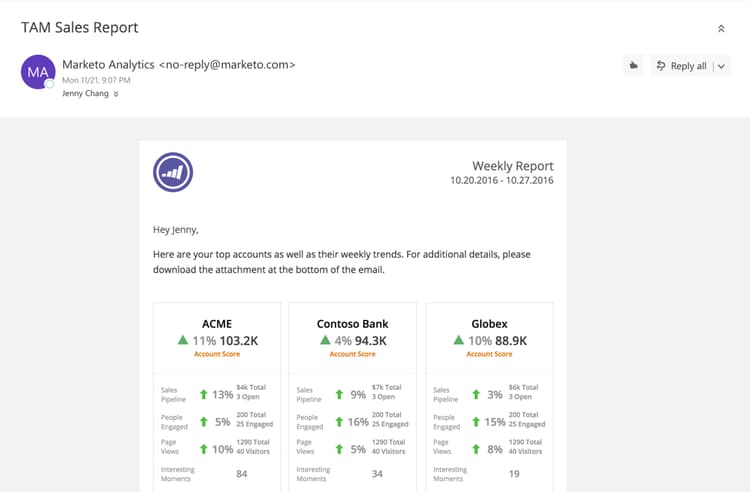 Ontvang wekelijks een e-mail met je topaccounts en hun wekelijkse trends.