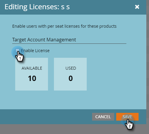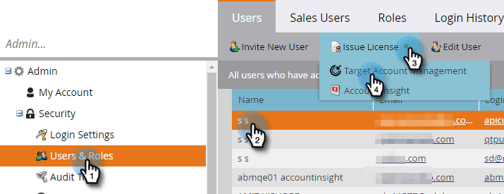 Klik op Users & Roles. Selecteer de gebruiker aan wie de licentie moet worden verleend, klik op de vervolgkeuzelijst Issue License en selecteer Target Account Management .
