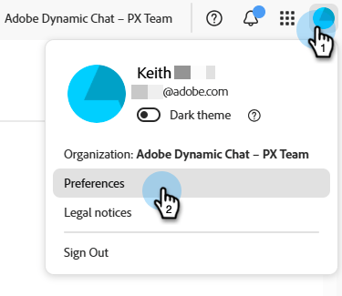 Voor uw homepage van Adobe Experience Cloud, klik het pictogram van de Rekening en selecteer Voorkeur.