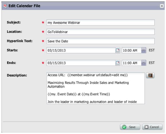 Creeer een kalenderdossier als a Mijn Symbolische dat in uw gebeurtenisbevestiging en herinneringse-mails moet worden gebruikt. In dit geïntegreerde kalenderbestand (bijvoorbeeld het .ics-bestand) worden alle tokens weergegeven, inclusief Mijn tokens en de {{member.webinar URL}} -token.