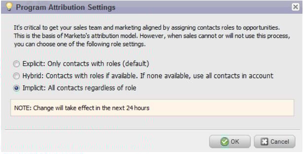 U kunt de toewijzingsinstellingen van het programma wijzigen in een van de drie opties. Als u deze instelling wijzigt, worden Marketo- of CRM-gegevens niet gewijzigd. De manier waarop rapporten worden uitgevoerd, verandert en u kunt deze instelling op elk gewenst moment herstellen.