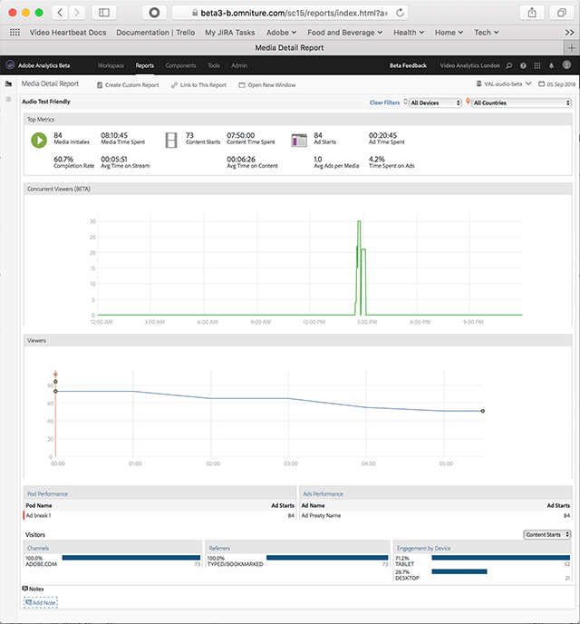 Op het dashboard Mediadetail worden gedetailleerde gegevens weergegeven voor alle inhoud, waaronder gelijktijdige viewers of listeners, het starten van de inhoud, de voltooiingssnelheid, de doorgebrachte tijd en het starten van de advertentie.