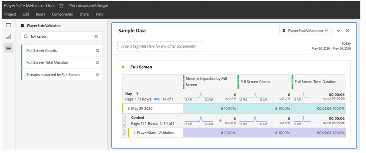 Alle metriek van de spelerstaat kan voor om het even welke rapporteringsvisualisatie beschikbaar in Analysis Workspace of een component (segment, berekende metriek) worden gebruikt zodra een rapportreeks voor het volgen van de spelerstaat wordt toegelaten. Deze metriek zou van Admin Console voor elk individueel rapport kunnen worden toegelaten gebruikend Media die Opstelling melden (geef Montages > Mediabeheer > Mediarapportering uit).
