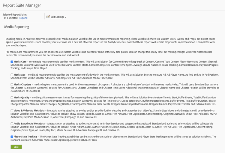 a.media.states.[state.name].set = true— Ingesteld op true als de status ten minste eenmaal is ingesteld voor elke specifieke weergave van een stream.a.media.states.[state.name].count = 4— Geeft het aantal instanties van een status aan tijdens elke afzonderlijke afspeelbewerking van een stream.a.media.states.[state.name].time = 240— Geeft de totale frameduur aan in seconden per afzonderlijke afspeelbewerking van een stream