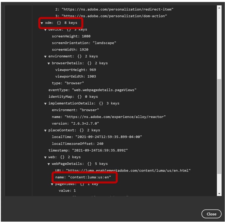 web.webPageDetails.nameen de waarde vancontent:luma:us:en. Deze stap zorgt ervoor dat u een eigenschap brandt wanneer u de homepage laadt. -