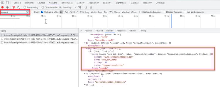Vouw de nuttige lading uit om de verwachte koekjesdetails, zoals eerder gevormd in Audience Manager te bekijken. In dit voorbeeld wordt de verwachte cookienaam