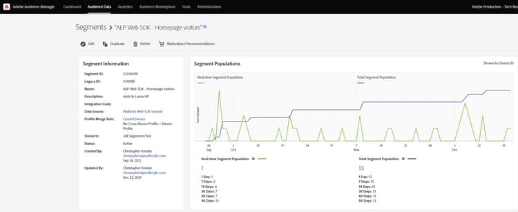 Tot slot zou u het segment in de interface van Audience Manager moeten openen en ervoor zorgen dat de Populaties van het Segment hebben verhoogd: