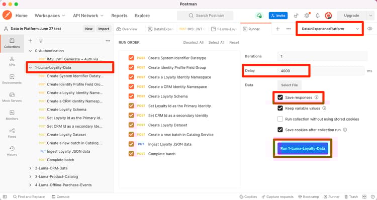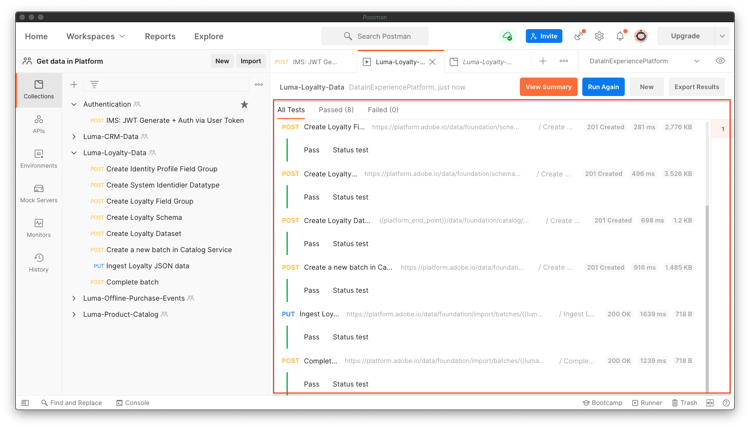 note note NOTE 1-Luma-Loyalty-Gegevens leidt tot een schema voor de gegevens van de klantenloyaliteit. Het schema is gebaseerd op de individuele klasse van het Profiel XDM, standaardgebiedsgroep, en een groep en een gegevenstype van het douanegebied. De inzameling leidt tot een dataset gebruikend het schema en uploadt de gegevens van de steekproefklantenloyaliteit aan Adobe Experience Platform. note note NOTE Als om het even welke inzamelingsverzoeken tijdens de de inzamelingsloopler van Postman ontbreken, houd de uitvoering tegen en stel de inzamelingsverzoeken één voor één in werking. -