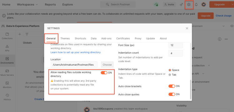 note note NOTE Als bestanden vanuit de werkmap worden geladen, worden ze op alle apparaten probleemloos uitgevoerd als dezelfde bestanden op de andere apparaten worden opgeslagen. Als u echter bestanden van buiten de werkmap wilt uitvoeren, moet een instelling worden ingeschakeld om dezelfde intentie aan te geven. Als uw FILE_PATHniet hetzelfde is als het pad naar de werkmap van Postman , moet deze optie zijn ingeschakeld. -