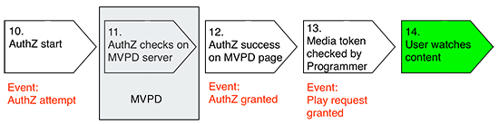 De stroom omvat ronde-reizen aan MVPDs voor zowel Authentificatie (#5 tot #7) als Vergunning (#11).