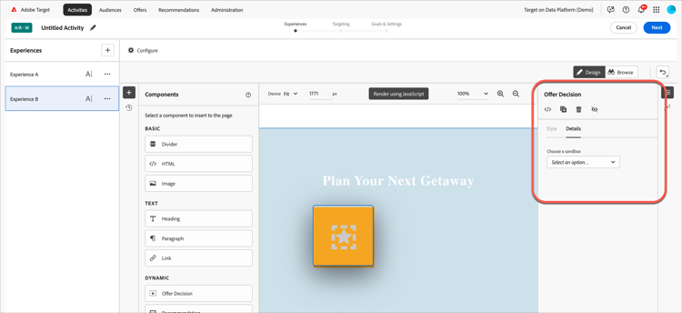 Selecteer in de Add Offer Decision -rail rechts van de VEC de gewenste sandbox en klik vervolgens op Offerte Decision.placement selecteren.