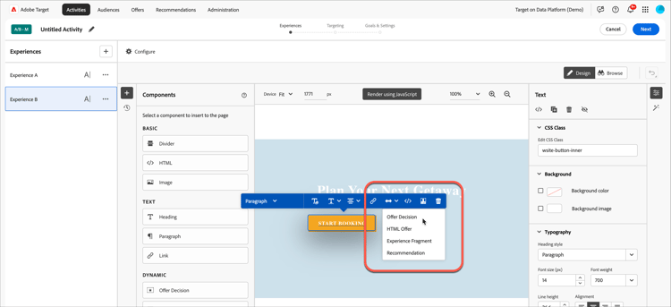 De optie Offer Decision is alleen beschikbaar bij het bewerken of maken van handmatige A/B Test of Experience Targeting (XT) activiteiten. Deze optie is niet beschikbaar voor andere typen activiteiten. Welke opties beschikbaar zijn in het menu, is afhankelijk van het geselecteerde element.