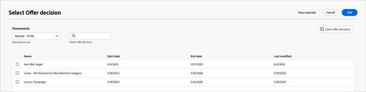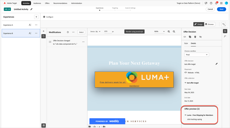 Voeg via Adobe Journey Optimizer gemaakte aanbiedingsbeslissingen toe aan Target -activiteiten (handmatig A/B Test of Experience Targeting ) met behulp van Visual Experience Composer (VEC) of Form-Based Composer persoonlijke aanbiedingen te testen en te leveren aan uw bezoekers op de binnenkomende kanalen die worden aangedreven door Target .