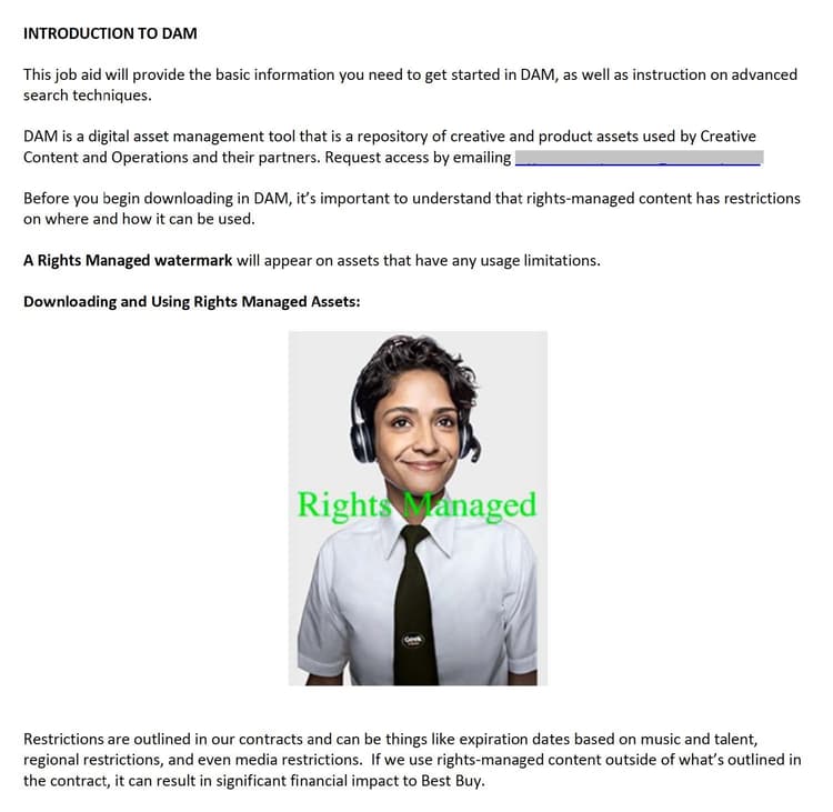 De eLearning-module begint met een boodschap van de Senior Vice President van Creative en Media om gebruikers eraan te herinneren waarom rechtenbeheer belangrijk is en wat hun rol daarin is. Verder wordt in de eLearning-module uitgelegd hoe u door rechten beheerde assets kunt identificeren en hoe belangrijk het is om gebruiksrechten te respecteren.